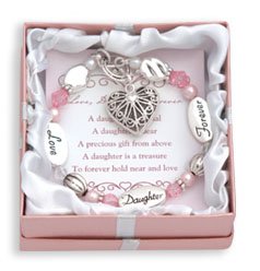Enjoy the beauty of this silver-plated and faux-crystal Expressively Yours bracelet. The Love, Daughter, and Forever Words are on both sides of the silver bead. It is finished off with a heart charm and a toggle clasp. Included with this bracelet is this inspirational saying: A daughter is special, A daughter is dear, A precious gift from above, A daughter is a treasure, To forever hold hear and dear. It comes packaged in a beautiful gift box with a ribbon-ready to give as a gift. Ages 13+ 8″ long