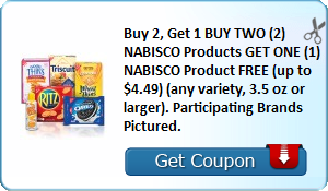 This awesome coupon is back! Be sure to print this coupon now! This coupon is BUY TWO (2) NABISCO Products GET ONE (1) NABISCO Product FREE (up to $4.49) (any variety, 3.5 oz or larger). Participating Brands Pictured. I’m sure you can find a great deal on these Nabisco products pictures though since the coupon value is good up to $4.49!