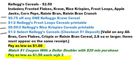 2. We add all the available coupons for each item. Then we put the price that is from the best available coupon listed. This week for dollar doublers we put in green the price it would be after using doublers with a min $20 purchase – don’t forget that.